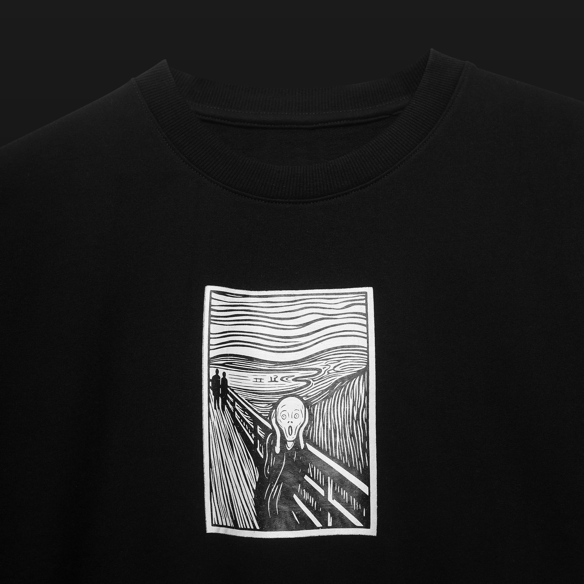 Inspired by Edvard Munch’s The Scream, this T-shirt reimagines the iconic artwork in monochrome. The front captures emotion in its rawest form, while the back reads “Drowning in Existence”, anchoring the piece in the quiet hum of modern life. This tee stands at the intersection of art and introspection!